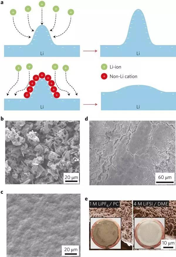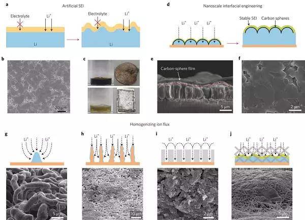 圖1b總結(jié)了金屬鋰負(fù)極最主要的問題。在鋰電鍍的過程中,巨大的體積膨脹使SEI破裂(步驟1),促進(jìn)鋰枝晶在裂縫處生長(zhǎng)(步驟2)。在鋰剝離的過程中,體積變化進(jìn)一步破壞SEI層,而從結(jié)點(diǎn)處剝離則會(huì)打斷電接觸形成“死”鋰(金屬鋰從基底上孤立,步驟3),不斷循環(huán)之后,以上過程將會(huì)反復(fù)發(fā)生最終形成多孔鋰電極,造成容量急劇降低。更詳細(xì)的聯(lián)系如圖1c所示。SEI的斷裂,化學(xué)副反應(yīng),枝晶和“死”鋰的形成,最終導(dǎo)致了嚴(yán)重的安全問題和容量下降。