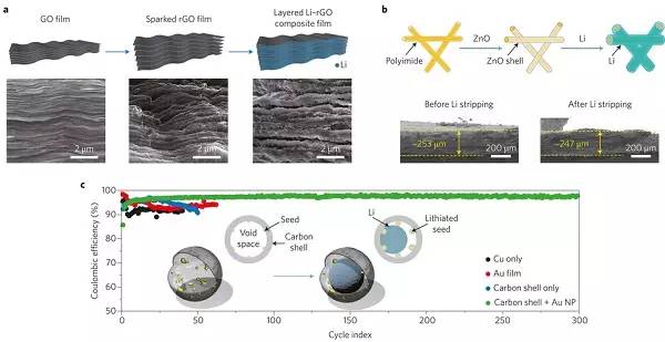 c.不同的電極在烷基碳酸鹽電解液中和0.5 mA cm?2電流密度下循環(huán)的庫(kù)倫效率以及金屬鋰膠囊的示意圖,金納米顆粒(Au NP)充當(dāng)鋰成核的晶種