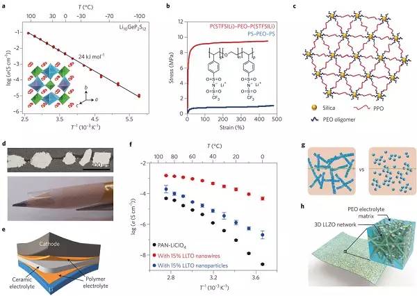 將固態(tài)聚合物電解質(zhì)與鋰離子電導(dǎo)率高的無機(jī)陶瓷結(jié)合是一種新的思路。將一個(gè)顆粒厚的Li1.6Al0.5Ti0.95Ta0.5(PO4)3與柔韌的聚合物結(jié)合,得到了靈活的且不產(chǎn)生枝晶的電解質(zhì)(圖5d)。最近,一種聚合物/陶瓷/聚合物三明治結(jié)構(gòu)被提出(圖5e)。在這種結(jié)構(gòu)下,Li1.3Al0.3Ti1.7(PO4)3(LATP)與聚(乙烯醇)甲基醚丙烯酸酯結(jié)合,既有柔軟的表面又有機(jī)械強(qiáng)度高的陶瓷體相。此外將一維Li3xLa2/3–xTiO3(LLTO)納米線與聚丙烯腈混合可以提供連續(xù)的鋰離子通道,室溫離子電導(dǎo)率可達(dá)0.1 mS cm-1(圖5f,g)。將石榴石相Li7La3Zr2O12(LLZO)納米線與聚環(huán)氧乙烯(PEO)結(jié)合也有類似的效應(yīng)。