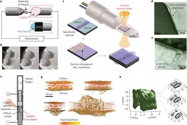 e.液體電池中原位TEM對(duì)鋰枝晶生長(zhǎng)的觀察