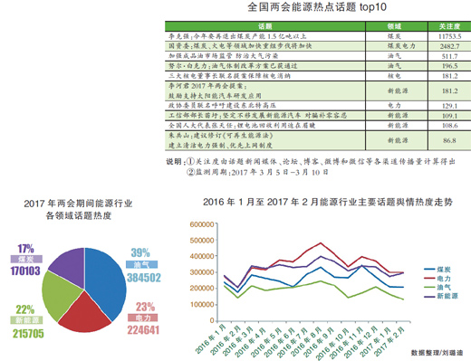 中國儲能網(wǎng)訊:2017年全國兩會進(jìn)入收官階段,在眾多焦點話題之中,能源行業(yè)的改革與發(fā)展再次成為代表、委員、媒體、公眾關(guān)注的交集。在此背景下,人民網(wǎng)輿情監(jiān)測室通過檢索計算新聞媒體、論壇、博客、微博和微信渠道傳播量,辨識出關(guān)注度排名前十的能源領(lǐng)域熱點話題。輿情識風(fēng)向。這些熱點話題的分布和關(guān)注度差異,從某種程度上映射出我國能源產(chǎn)業(yè)未來前進(jìn)的方向和輿論的期待,值得能源人參閱和思考。本期《中國能源報》特此重磅推出“全國兩會能源輿情觀察”,幫助每一位關(guān)注能源行業(yè)的人讀懂讀透兩會能源熱點。