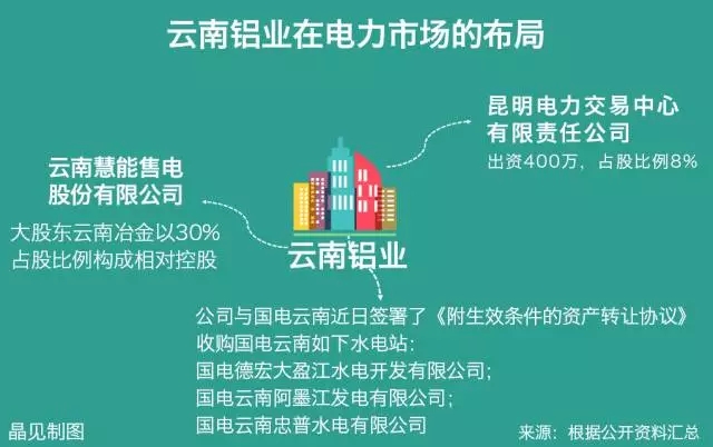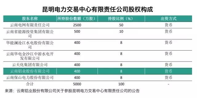 2016年11月18日,云南鋁業(yè)發(fā)布《關(guān)于參股昆明電力交易中心有限責(zé)任公司的公告》,稱為了加快實(shí)施“拓展兩頭、優(yōu)化中間”發(fā)展戰(zhàn)略,提升水電鋁加工一體化產(chǎn)業(yè)鏈的低成本能源優(yōu)勢,完善市場化用電機(jī)制,“控制用電成本”,與云南電網(wǎng)有限公司等其他六家企業(yè)共同出資成立昆明電力交易中心有限公司,注冊資本5000萬元。