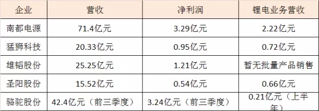 猛獅科技2月28日發(fā)布2016年度業(yè)績快報,報告期內(nèi)公司實現(xiàn)營業(yè)收入20.33億元,同比增長269%;歸屬于上市公司股東的凈利潤9460萬元,同比增長3298%;其中,上半年鋰電池業(yè)務實現(xiàn)營業(yè)收入7229萬元,同比增長764%。