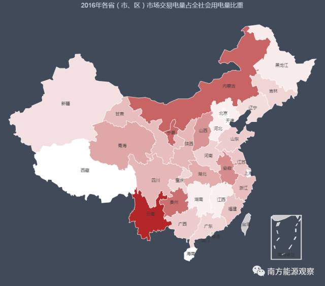 圖2 2016年各?。ㄊ小^(qū))直接交易電量占全社會用電量比重(圖中顏色越深,表示比例越大,誰是電改的積極分子?)