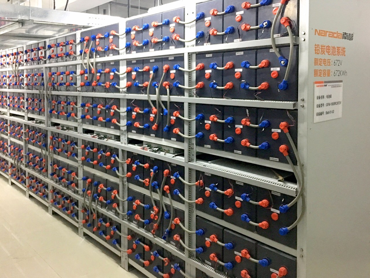 電站一期工程的鉛炭電池儲(chǔ)能規(guī)模功率為0.75MW,額定儲(chǔ)能容量為6MWh。主要設(shè)備包括南都鉛炭電池4032節(jié)、電池管理系統(tǒng)BMS控制柜3臺(tái)、交流并網(wǎng)開關(guān)柜2臺(tái)、監(jiān)控通信柜等。