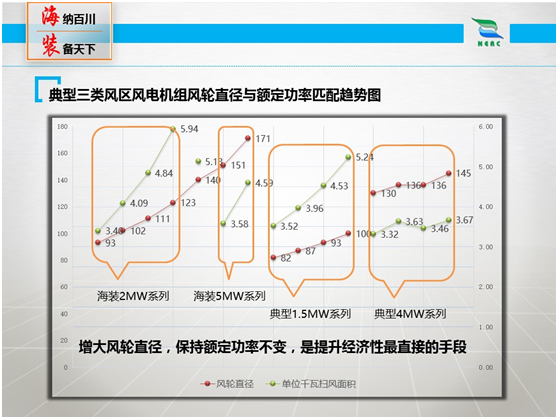 為了直觀的反映兩者之間的關系,行業(yè)制定了一項術語——單位千瓦掃風面積,其計算公式為:單位千瓦掃風面積=(π×風輪直徑2/4)/額定功率。風輪直徑代表著發(fā)電量,額定功率代表著投資成本,單位千瓦掃風面積意味著性價比。