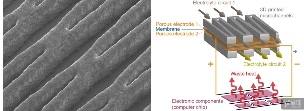 此前的液流電池通常都應用在大規(guī)模能量存儲中,例如與風電場和太陽能發(fā)電廠組合使用。而把這項技術用在微型設備上目前還是首次。新型液流電池的輸出也達到了新突破,每平方厘米電池表面能產生 1.4 瓦特功率。即使減去將液體電解質泵送到電池所需的功率,所得的凈功率密度仍為每平方厘米1瓦特。除此之外研究人員在實驗中發(fā)現(xiàn),電解質液體實際上能夠冷卻芯片。它們散發(fā)的熱量多于電池產生的電能。開發(fā)團隊還使用 3D 打印技術,建立了楔形微通道系統(tǒng)。