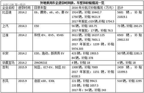 3月21日,北京市經(jīng)信委稱,2017年北京市擬撥付第一批新能源汽車補助資金共涉及4066輛,擬撥付資金51789.135萬元。在純電動乘用車方面,奇瑞汽車、吉利汽車、眾泰汽車、東風汽車、比亞迪、江淮汽車、上汽七家企業(yè)的3368輛車將分約1.7億元補貼。