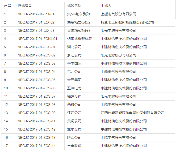 中國儲能網(wǎng)訊:3月21日,國家電力投資集團公司公布了其二〇一七年度第十批集中招標(第一批光伏并網(wǎng)逆變器、組件設備)招標結果公示。結果顯示,億晶光電、天合光能、樂葉光伏、特變電工、陽光電源、上能電氣、中節(jié)能太陽能、 中電科電子、 光為綠色能源、中建材信息技術、江西儀能新能源等11家企業(yè)成功中標,成為2017年光伏行業(yè)首批設備供應商。