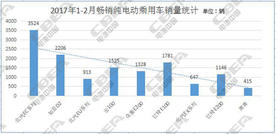 據(jù)不完全統(tǒng)計(jì),2017年1-2月,我國(guó)純電動(dòng)乘用車銷量排行前10位的品牌車型分別是北汽EC系列(3524輛)、知豆D2(2206輛)、江鈴E100(1781輛)、云100(1525輛)、眾泰E200(1328輛)、江鈴E200(1146輛)、眾泰TTEV(979輛)、北汽EU系列(913輛)、北汽EX系列(647輛)、奔奔(415輛)。