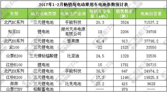 2017年前兩個(gè)月,這些在市面上比較暢銷的純電動(dòng)乘用車品牌車型,其所配動(dòng)力電池出貨量也大不相同。出貨量最高的是北汽EC系列,所配電池是三元鋰電池,由孚能科技生產(chǎn),每輛車電池的帶電量為20.3kWh,1-2月該系列車型所配電池出貨量為71537.2kWh。