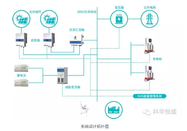 為改善秀峰充電站的用電環(huán)境及電網(wǎng)調(diào)節(jié),科華恒盛通過現(xiàn)場調(diào)研與技術(shù)開發(fā),提出一套創(chuàng)新性的光儲充系統(tǒng)整體解決方案。即在充電站的基礎(chǔ)上增加光伏發(fā)電、儲能系統(tǒng)、應(yīng)急充電等系統(tǒng)進(jìn)行電網(wǎng)智能互動。一方面,利用儲能系統(tǒng),全方位護(hù)航充電站的用電安全,避免快充對電網(wǎng)造成沖擊;另一方面,通過綠色電源供應(yīng)補充、削峰填谷等方式,為新能源電動公交大巴提供更為高效且經(jīng)濟(jì)的電能。