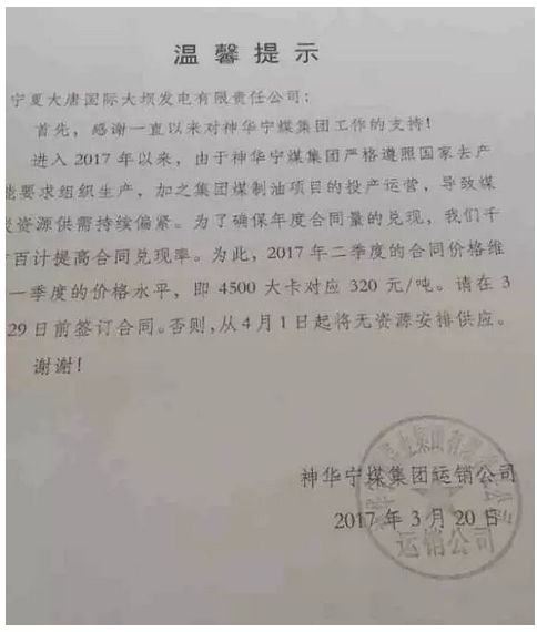 但神華寧煤集團(tuán)不為所動,并隨后回應(yīng)稱不會降價(jià)。記者在署名為神華寧煤集團(tuán)運(yùn)銷公司于2017年3月20日分別回復(fù)給七家電企的《溫馨提示》中發(fā)現(xiàn),神華寧煤集團(tuán)對此給出的回復(fù)是,“2017年二季度的合同價(jià)格維持一季度的價(jià)格水平,即4500大卡對應(yīng)320元/噸,請?jiān)?月29日前簽訂合同。否則,從4月1日起將無資源安排供應(yīng)。謝謝!”