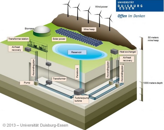 該項(xiàng)目利用26千米的礦井的一部分來儲(chǔ)存一百萬立方米的水,建設(shè)抽水蓄能,儲(chǔ)存附近多余的光和風(fēng)。由于目前抽水蓄能的選址越來越難,因此公布的抽水蓄能新項(xiàng)目很少。截止到2018年,德國將關(guān)閉許多煤礦,意味著將煤礦改造為抽水蓄能庫的項(xiàng)目將越來越多,且能夠做到經(jīng)濟(jì)可行。