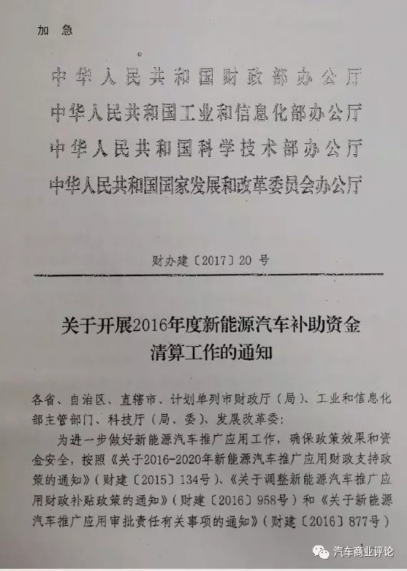 今日,一份寫有“加急”字樣的文件流出。這就是財政部、工信部、科技部、發(fā)改委等四部委3月20日聯(lián)合會簽的《關(guān)于開展2016年度新能源汽車補貼資金清算工作的通知》(以下簡稱“加急文件”)。