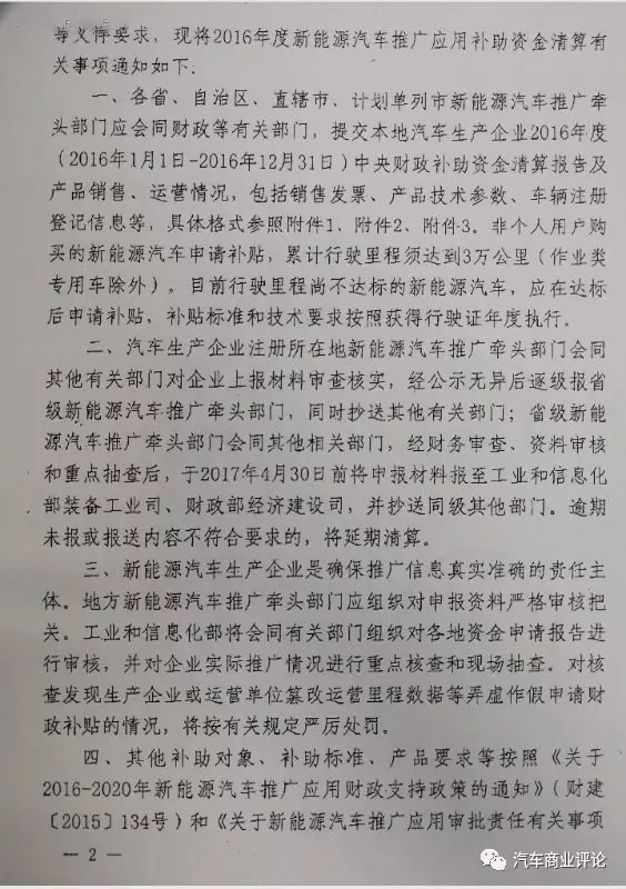 2016年12月29日發(fā)布的《關(guān)于調(diào)整新能源汽車推廣應(yīng)用財政補貼政策的通知》,對補貼資金撥付方式進行了改動:由之前的先預(yù)撥再清算改為先清算再撥付。