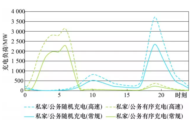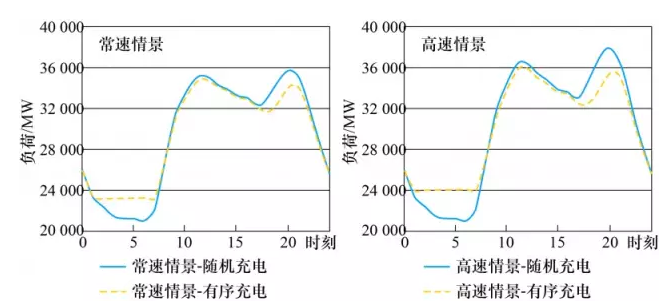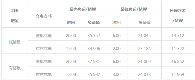 圖6顯示了2種電動(dòng)汽車發(fā)展情境下,隨機(jī)充電及有序充電負(fù)荷曲線,可見有序充電使電網(wǎng)高峰負(fù)荷一定程度降低,負(fù)荷峰谷差明顯減小,大部分充電負(fù)荷轉(zhuǎn)移至凌晨負(fù)荷低谷時(shí)段。