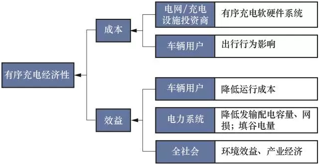 電動(dòng)汽車參與需求響應(yīng)的經(jīng)濟(jì)性包括成本和效益兩方面,其中充電調(diào)節(jié)的成本包括實(shí)現(xiàn)有序充電技術(shù)的軟硬件成本以及電動(dòng)汽車用戶改變充電行為的支付意愿;充電調(diào)節(jié)的效益主要包括電動(dòng)汽車有序充電的高峰負(fù)荷削減、填谷電量以及由此產(chǎn)生的環(huán)境效益(見圖8)。