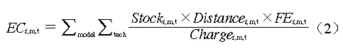 式中:ECi,m,t為第i年m型車輛t動(dòng)力技術(shù)充電量需求,kWh;Stocki,m,t為第i年m型車輛t動(dòng)力技術(shù)車輛數(shù),輛;Distancei,m,t為第i年m型車輛t動(dòng)力技術(shù)運(yùn)行里程,km;FEi,m,t為第i年m型車輛t動(dòng)力技術(shù)能效,kWh/km;Chargei,m,t為第i年m型車輛t動(dòng)力技術(shù),%。