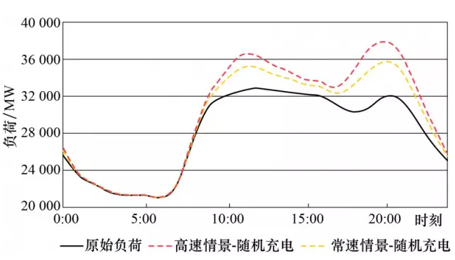 單輛電動(dòng)汽車充電負(fù)荷曲線由充電起始時(shí)間及持續(xù)充電時(shí)間決定,而電動(dòng)汽車群充電負(fù)荷由多輛單體電動(dòng)汽車充電負(fù)荷曲線疊加而成。本研究基于上海電動(dòng)汽車數(shù)量增速及電動(dòng)汽車用戶調(diào)研,測(cè)算了電動(dòng)汽車充電負(fù)荷曲線。結(jié)果顯示(見圖4),在電動(dòng)汽車高增速情景下,電動(dòng)汽車充電負(fù)荷高峰為6.33GW,出現(xiàn)于晚間19:00點(diǎn)左右,充電負(fù)荷低谷為15MW,出現(xiàn)于凌晨4點(diǎn)左右;疊加電動(dòng)汽車充電負(fù)荷曲線后,電網(wǎng)負(fù)荷高峰為37.93GW,出現(xiàn)于晚間20:00左右,充電負(fù)荷低谷為21.07GW,出現(xiàn)于上午6:00左右,電網(wǎng)負(fù)荷峰谷差從11.90GW增加到16.86GW。綜合來(lái)看,在隨機(jī)充電情況下,電動(dòng)汽車充電負(fù)荷將顯著提升傍晚電力負(fù)荷高峰,且全天峰谷差也將有所增加,從而對(duì)電網(wǎng)運(yùn)行產(chǎn)生一定壓力。