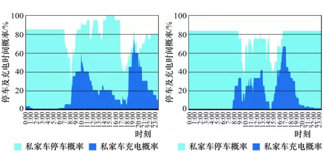 為深入分析上海地區(qū)不同電動(dòng)汽車車型充電行為特征,本研究分別對(duì)電動(dòng)私家車、電動(dòng)公務(wù)車兩類車型用戶的停車及充電概率進(jìn)行了對(duì)比。結(jié)果如圖5所示,其中淺色、深色部分代表停車概率及隨機(jī)充電概率。調(diào)研結(jié)果印證了上海地區(qū)這兩類車型具有較大的充電調(diào)節(jié)空間,特別是在負(fù)荷峰谷時(shí)段(中午12點(diǎn)及凌晨5—6點(diǎn)),相當(dāng)比例的電動(dòng)汽車處于非充電停車狀態(tài),有潛力參與需求響應(yīng)調(diào)節(jié)。