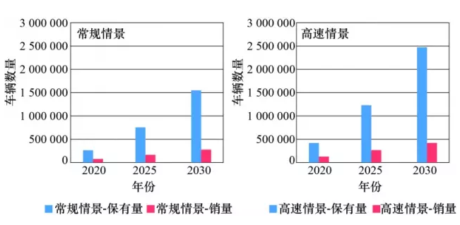 上海私人購(gòu)買電動(dòng)汽車享受免費(fèi)牌照及現(xiàn)金補(bǔ)貼政策,考慮到上海市目前高達(dá)數(shù)萬(wàn)元的牌照價(jià)格,扶持政策無(wú)疑有力激勵(lì)了電動(dòng)汽車發(fā)展??紤]到現(xiàn)行的機(jī)動(dòng)車限號(hào)及財(cái)稅扶持政策在未來(lái)存在一定的不確定性,研究設(shè)定2種電動(dòng)汽車發(fā)展情景,即常規(guī)發(fā)展情景和高速發(fā)展情景(見圖2)。