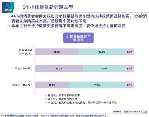 益普索(Ipsos)數(shù)據(jù)顯示,44%的消費者會因為政府對小排量新能源車型的扶持政策而選擇購買,8%的消費者認為購買成本高,后續(xù)用車便利性不足;非車主對于扶持政策更多持有不確定態(tài)度,要依據(jù)扶持力度而決定。