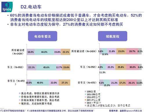 對于電動車,60%的益普索(Ipsos)被訪者表示,當電動車價格接近或者低于普通車,才會考慮購買電動車,52%的消費者當純電動車的續(xù)航里程達到200公里以上才達到其購買標準;非車主對電動車態(tài)度較為保守,27%的消費者無論如何都不考慮購買。