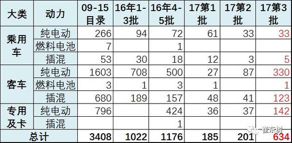 《新能源汽車推廣應(yīng)用推薦車型目錄》(2017年第1批),共包括39戶企業(yè)的185個車型,其中純電動產(chǎn)品共35戶企業(yè)124個型號、插電式混合動力產(chǎn)品共12戶企業(yè)60個型號、燃料電池產(chǎn)品共1戶企業(yè)1個型號。《新能源汽車推廣應(yīng)用推薦車型目錄》(2017年第2批)共包括40戶企業(yè)的201個車型,其中純電動產(chǎn)品共40戶企業(yè)157個型號、插電式混合動力產(chǎn)品共8戶企業(yè)44個型號。第三批共包括87戶企業(yè)的634個車型。其中純電動產(chǎn)品共85戶企業(yè)505個型號、插電式混合動力產(chǎn)品共21戶企業(yè)128個型號、燃料電池產(chǎn)品共1戶企業(yè)1個型號。。