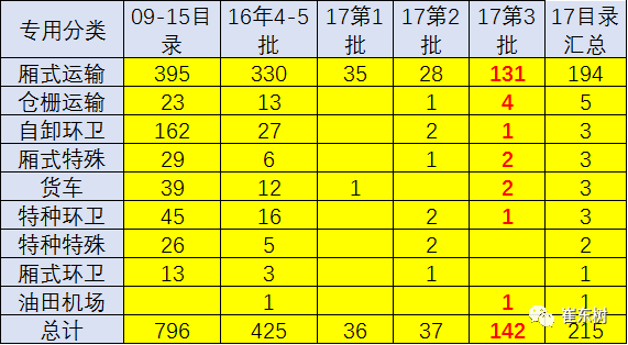 暫時專用車的目錄進入車型主要是廂式運輸車,占到絕對比重。而其他的環(huán)衛(wèi)、郵政等真正的特殊專用車實際較少。17年第三批的專用車目錄的大量推出是對新能源車的利好因素。