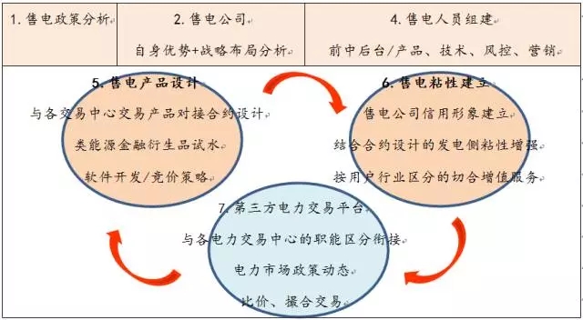 目前感受到大家普遍關(guān)心的售電事業(yè)重心一是在于基于信息滯后不對等或者所處地區(qū)行業(yè)不同造成的對不同準(zhǔn)入或者流程不明問題,二是各大用戶直接交易或售電可參與交易地區(qū)的競價策略。一時間,相關(guān)衍生出的各種政策咨詢,售電增值服務(wù),售電內(nèi)部軟件開發(fā),售電第三方交易平臺平行開花??上跎俑惺艿秸娴目梢园央姰?dāng)作“商品”來做售電公司。心中的售電如圖是各環(huán)相互銜接相互影響支撐的,具體還需根據(jù)個售電公司成立背景初衷來做分析