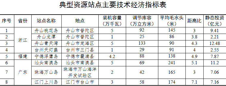 在上述資源普查站點(diǎn)基礎(chǔ)上,考慮地形條件、工程布置、節(jié)約淡水資源等多方面因素,進(jìn)一步篩選出建設(shè)條件相對(duì)較好的8個(gè)典型站點(diǎn),分布在浙江、福建、廣東3省,作為下一步研究重點(diǎn)。(具體見附件2)