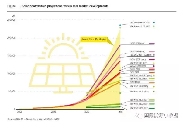 以業(yè)界最權(quán)威的國(guó)際能源署(IEA)的歷年“世界能源展望”(WEO)中的“基準(zhǔn)情境分析”(reference scenario)為例,2000-2009年版的WEO對(duì)2015年全球光伏裝機(jī)預(yù)測(cè)都在50吉瓦以下。直到2011年版的WEO,距離2015年不到5年的情況下,對(duì)于光伏裝機(jī)的預(yù)測(cè)依然錯(cuò)的離譜:認(rèn)為2015年光伏裝機(jī)最樂(lè)觀的情境下也不過(guò)150吉瓦。