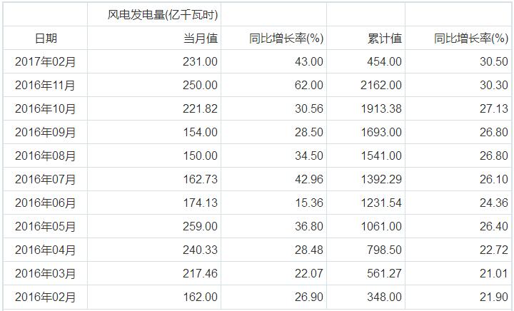 以下為2016年2月至2017年2月我國風(fēng)電發(fā)電量統(tǒng)計: