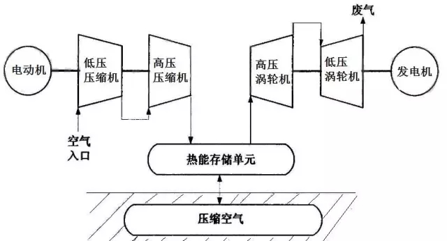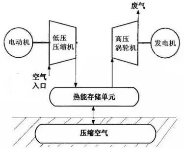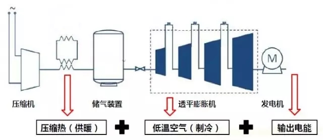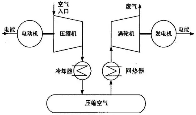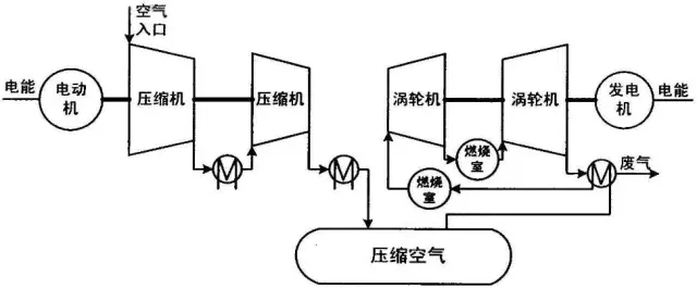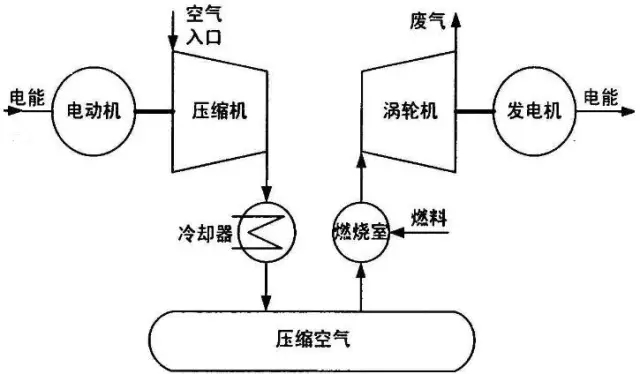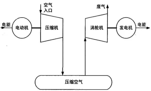 壓縮空氣的基本原理很簡(jiǎn)單,在電網(wǎng)負(fù)荷低谷期將電能用于壓縮空氣,將空氣高壓密封在報(bào)廢礦井、儲(chǔ)氣罐、山洞、過(guò)期油氣井或新建儲(chǔ)氣井中,在電網(wǎng)負(fù)荷高峰期釋放壓縮空氣推動(dòng)汽輪機(jī)發(fā)電的儲(chǔ)能方式,原理如下圖所示。若需要更近一步解釋,你只需鎖定儲(chǔ)氣罐內(nèi)的空氣即可,兩個(gè)動(dòng)作,充氣時(shí)儲(chǔ)存能量,膨脹時(shí)釋放能量。