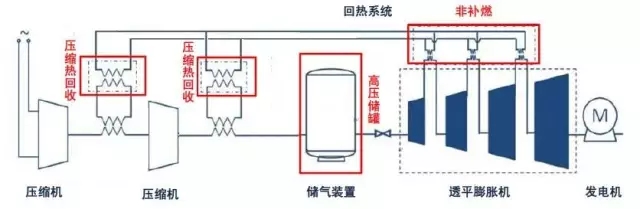 相較于原理型系統(tǒng),回?zé)嵯到y(tǒng)儲(chǔ)電效率有所增加,然而它的不足在于,冷卻器和回?zé)崞鞣珠_(kāi)設(shè)置,在熱量回收過(guò)程中存在較大熱損失。為解決這一問(wèn)題,有人提出絕熱壓縮空氣系統(tǒng),變異2,參照下圖。將壓縮過(guò)程中產(chǎn)生的熱量存儲(chǔ)起來(lái),然后在發(fā)電過(guò)程中用這部分熱量預(yù)熱壓縮空氣,冷卻器和回?zé)崞骱蠟橐惑w,對(duì)外進(jìn)行絕熱處理,業(yè)內(nèi)稱作先進(jìn)絕熱壓縮空氣儲(chǔ)能系統(tǒng)(AA-CAES),該系統(tǒng)面臨的最大挑戰(zhàn)是如何經(jīng)濟(jì)、有效地設(shè)計(jì)和制造出壓力工作范圍大的壓縮機(jī)、渦輪機(jī)和除熱器。