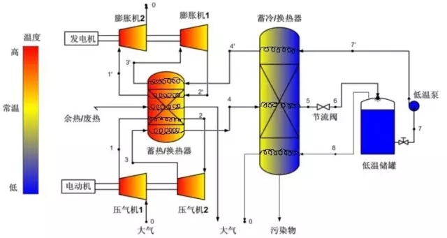 壓空系統(tǒng)的技術(shù)痛點(diǎn)在于氣體的密度太低,常壓下空氣密度為1.25kg/m3,即使在10Mpa高壓下密度也只有100kg/m3左右,相比水的1000kg/m3,差了足足十倍,這意味在相同儲(chǔ)存質(zhì)量下,空氣的罐子要比水大十倍。要解決大規(guī)??諝獯鎯?chǔ)的方法至少有3個(gè),方法一,就地取材,尋找廢棄的礦井,進(jìn)行密封承壓方面的改造,然后將空氣壓入其中,這種方法既經(jīng)濟(jì)又可靠,而且儲(chǔ)量驚人,比如德國(guó)的Huntorf壓空電站可儲(chǔ)存30萬(wàn)立方的空氣,但是,這種方式受制于地形限制,靈活性差,比如我想在南京建一座壓空電站,即使金壇的溶洞再優(yōu)越,我也用不上。方法二,高壓儲(chǔ)氣罐,該方式操作靈活,完全不受地域地形限制,比如中科院在廊坊的示范項(xiàng)目,采用2個(gè)直徑2.4m,長(zhǎng)10m的儲(chǔ)罐,每個(gè)儲(chǔ)存45m3的高壓空氣,儲(chǔ)罐壓力10Mpa,儲(chǔ)罐設(shè)備屬于特種設(shè)備范疇,無(wú)論從制造,安裝還是運(yùn)行,都要經(jīng)過(guò)嚴(yán)格的檢查,成本相對(duì)較高。方法三,空氣液化。為了進(jìn)一步減小儲(chǔ)罐體積,有專家想到了變態(tài),將氣體液化,密度將增加上百倍,于是體積減少上百倍,通過(guò)設(shè)計(jì),使膨脹機(jī)出口的空氣溫度低于78.6K(-196.5℃)時(shí),空氣被液化,系統(tǒng)流程見(jiàn)下圖,這種系統(tǒng)的特點(diǎn)是體積小,管路復(fù)雜,效率低。我在一次講座上跟東大熱能所的肖睿教授聊天時(shí)得知,他測(cè)算過(guò)液化壓空儲(chǔ)能的理論效率60%,實(shí)際效率能打七折就已經(jīng)很不錯(cuò)了。