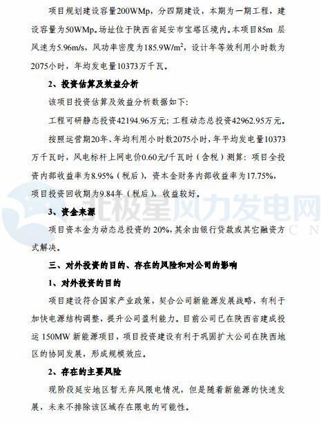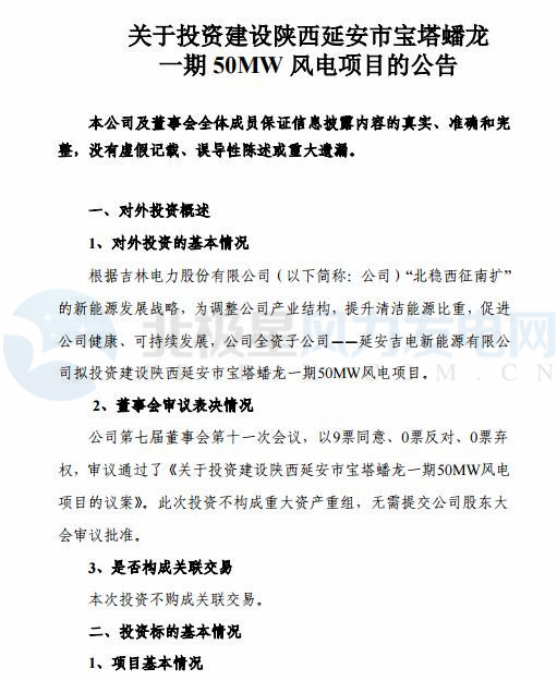 中國儲能網(wǎng)訊:根據(jù)“北穩(wěn)西征南擴” 的新能源發(fā)展戰(zhàn)略,為調整產業(yè)結構,提升清潔能源比重,促進公司健康、可持續(xù)發(fā)展,吉電股份全資子公司——延安吉電新能源有限公司擬投資建設陜西延安市寶塔蟠龍一期50MW風電項目,工程可研靜態(tài)投資4.22億元(42194.96萬元),工程動態(tài)總投資4.30億元(42962.95萬元)。