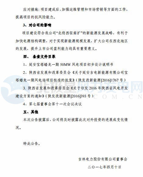 該項目建設符合國家產業(yè)政策,契合吉電股份新能源發(fā)展戰(zhàn)略,有利于加快電源結構調整,提升盈利能力。目前吉電股份已在陜西省建成投運 150MW 新能源項目,此次項目投資建設有利于鞏固擴大吉電股份在陜西地區(qū)的協(xié)同發(fā)展,形成規(guī)模效應。