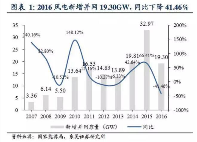 新增并網(wǎng)裝機19.30GW,同比下降 41.46%:2017年1月26日,國 家能源局發(fā)布2016年風電并網(wǎng)運行情況。2016年全年新增風電裝機19.30GW,同比下降41.46%;累計并網(wǎng)裝機達到148.64GW,同比增長14.92%。2016 年是我國風電開發(fā)往東部、南部轉(zhuǎn)移的突破之年,風電布局進一步優(yōu)化。受南方施工條件復雜以及夏季雨季、汛期的影響,施工周期拉長,并網(wǎng)進度延緩。