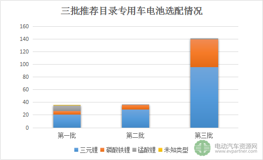 從第三批推薦目錄中車企選擇合作的電池企業(yè)看,在三元電池上,選擇與上海德朗能、比克電池與億緯鋰能合作的企業(yè)最多;選配磷酸鐵鋰的車企多選擇與沃特瑪合作;錳酸鐵鋰只有星恒一家,也只有一家車企選擇與之合作。