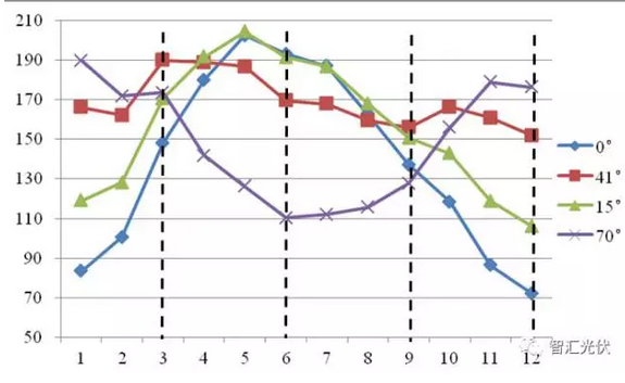 分別以3、6、9、12月為例,發(fā)電量最大的傾角分別為41°、0°、41°、70°。