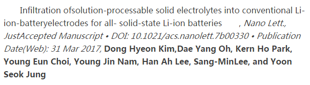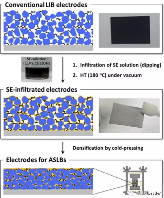 為了使全固態(tài)鋰離子電池的電極各個(gè)組份能夠均勻的混合,DongHyeonKim等人首先利用傳統(tǒng)工藝獲得了鋰離子電池電極極片,然后將固體電解質(zhì)Li6PS5Cl和0.4LiI-0.6Li4SnS4分別制成乙醇和甲醇溶液,將鋰離子電池極片浸入到上述溶液中,然后進(jìn)行干燥和碾壓,該工藝保證了固體電解質(zhì)與活性物質(zhì)之間均勻的混合,保證了電池良好的電化學(xué)性能。