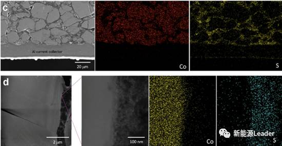 對(duì)上述制備的極片采用場(chǎng)發(fā)射顯微鏡SESEM和X射線能譜EDXS觀察元素分布,結(jié)果如下圖所示,可以看到,固體電解質(zhì)很好的占據(jù)了活性物質(zhì)顆粒之間的空間。