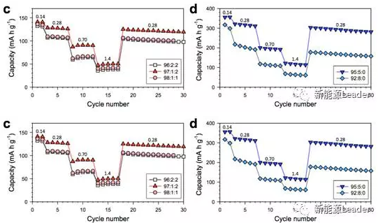 該固體電解質(zhì)的倍率性能測(cè)試如下圖所示,從結(jié)果來(lái)看,降低PVDF粘結(jié)劑的含量,可以有效的提升電池的倍率性能,這主要是因?yàn)檩^低的PVDF粘結(jié)劑含量,有助于提升固體電解質(zhì)與活性物質(zhì)之間的離子電導(dǎo)率,從而改善電池的倍率性能。但是降低導(dǎo)電劑SP的含量卻會(huì)導(dǎo)致倍率性能下降,這可能是因?yàn)殡姌O的電子導(dǎo)電性下降導(dǎo)致的。