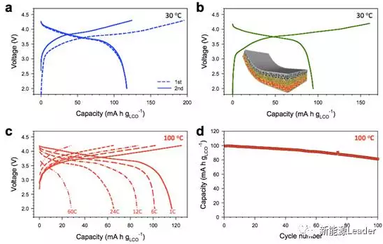 正極LiCoO2的可逆容量達(dá)到了141mAh/g,負(fù)極石墨材料則達(dá)到了364mAh/g(0.1C,30℃,半電池),同時(shí)該電池在100℃下,也表現(xiàn)出了很好的電化學(xué)性能,表明該電池具有很好的熱穩(wěn)定性和安全性。