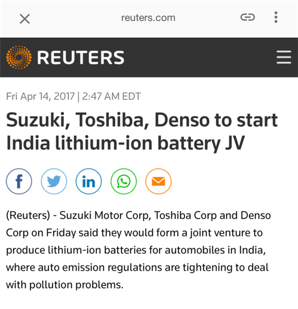 中國(guó)儲(chǔ)能網(wǎng)訊:據(jù)路透社4月14日?qǐng)?bào)道,鈴木汽車公司、東芝株式會(huì)社及電裝株式會(huì)社將在今年創(chuàng)建一家合資公司,在印度制造鋰電池。