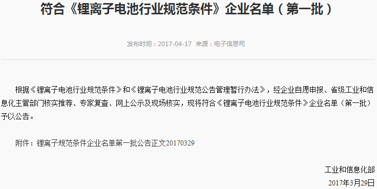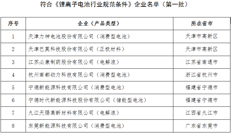 中國儲能網(wǎng)訊: 根據(jù)《鋰離子電池行業(yè)規(guī)范條件》和《鋰離子電池行業(yè)規(guī)范公告管理暫行辦法》,經(jīng)企業(yè)自愿申報、省級工業(yè)和信息化主管部門核實推薦、專家復查、網(wǎng)上公示及現(xiàn)場核實,現(xiàn)將符合《鋰離子電池行業(yè)規(guī)范條件》企業(yè)名單(第一批)予以公告。