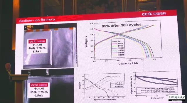 我們做了1.5Ah和0.5Ah兩種軟包全電池,正極材料采用前面提到的鎳錳氧化物,負極采用生物質(zhì)的硬碳材料,經(jīng)300次循環(huán)后容量衰降為15%。由此可見,鈉離子電池用廉價材料是可以制備的,而且電性能良好。