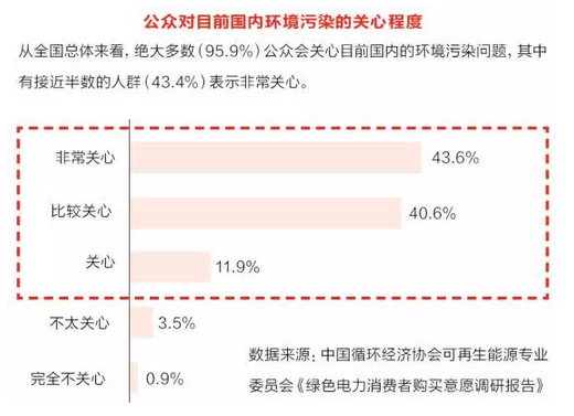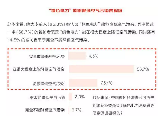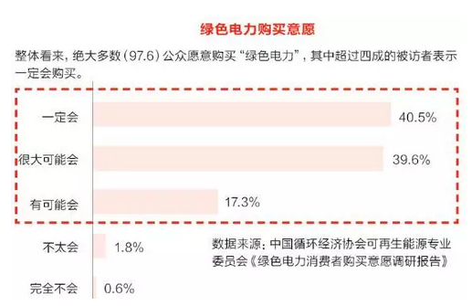 一份中國循環(huán)經(jīng)濟協(xié)會可再生能源專業(yè)委員會于2016年8月做的綠色電力消費者購買意愿調(diào)研報告顯示,超過八成的公眾知曉綠色電力,并認為綠色電力能夠在一定程度上降低空氣污染。絕大多數(shù)人(97.6%)表示愿意購買綠色電力,其中四成被訪者表示一定會購買。在愿意購買綠色電力的基礎(chǔ)上,大多數(shù)人(超過九成)可以接受一定程度上的費用增加。市場調(diào)查結(jié)果顯示,大量的城市居民已經(jīng)有充分的意識到使用綠色電力能夠減少空氣污染,甚至愿意為綠色電力支付更高的費用,卻苦于沒有選擇的權(quán)力和購買的渠道。